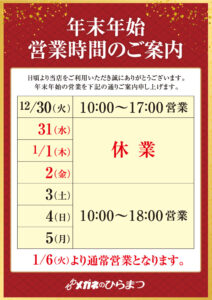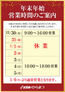 年末年始の営業日、営業時間のお知らせです。