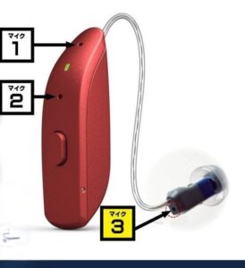 通常の耳掛け補聴器本体部分のマイク2つに加えて、世界初の3つ目のマイクを