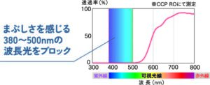 遮光レンズとは、まぶしさの原因となる短波長光(紫外線+青色光線)を効果的に低減し、それ以外の光を出来るだけ多く通すように作られた特殊カラーフィルターレンズのことです。